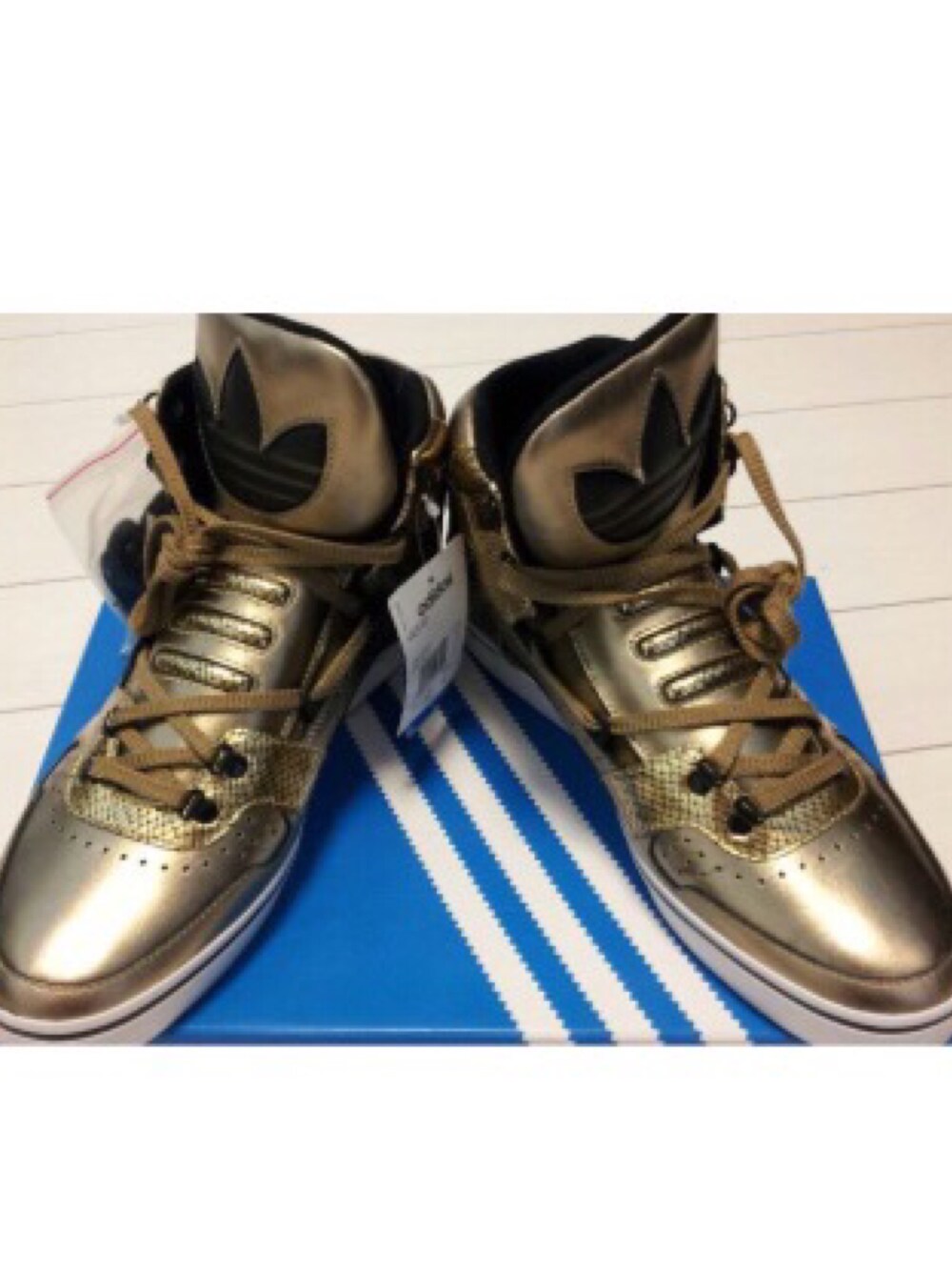 ゴールド系のスニーカーを着用したメンズの秋コーディネートの1枚目の写真