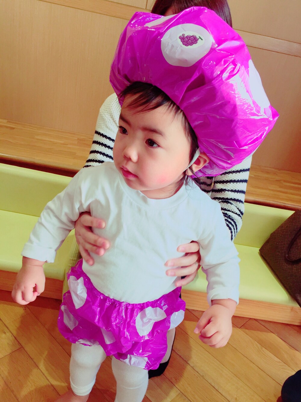 パープル系の帽子を着用したキッズの冬コーディネートの1枚目の写真
