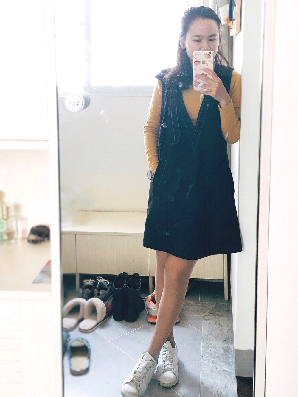 姜黄色打底+藏蓝色背心裙,裙子是大V领&A型,浅咖的丝袜和打底有呼应