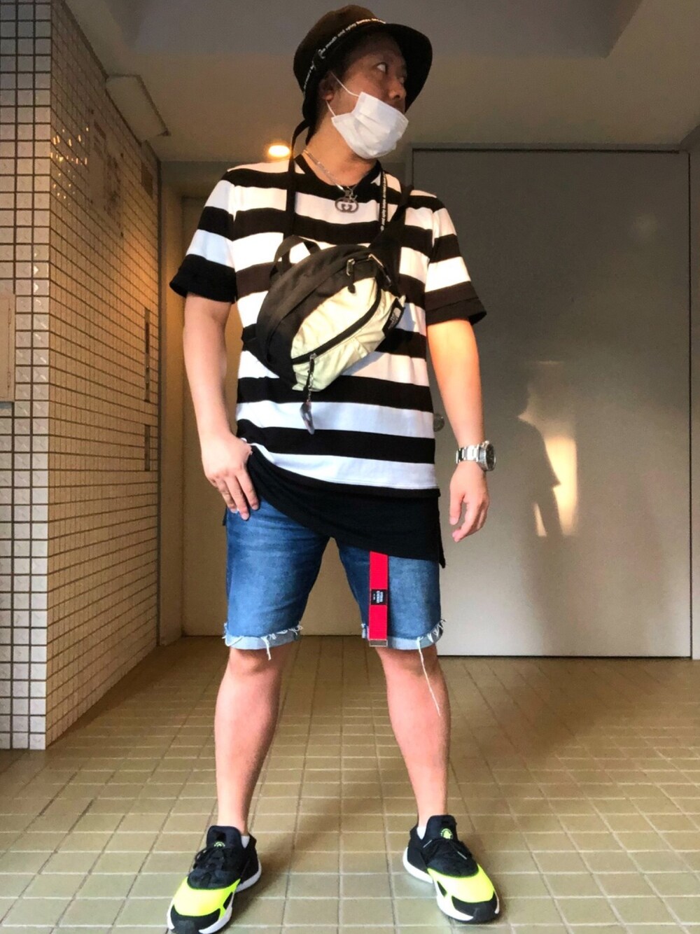 今日はAgemで手に入れた紐が長いバケットハット😎 ボーダーのTシャツは GU👕 ハーフパンツはおなじみ H&M👖 スニーカーはナイキのエアハラチドリフト👟 本日は涼しく過ごしやすい夏です東京😎