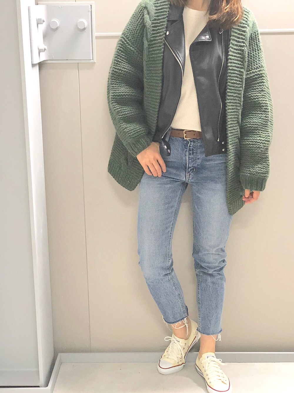 いつもご覧いただきありがとうございます♡ ニットガウンだけだと寒くなってきたのでライダースを重ね着🧥👖 いいね、セーブ、フォローしていただけたら嬉しいです😄💕
