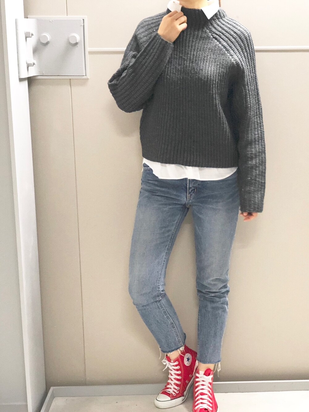 おはようございます☀ 今日は暖かいのでアウターはなしで ざっくりニットにシャツをレイヤード👔