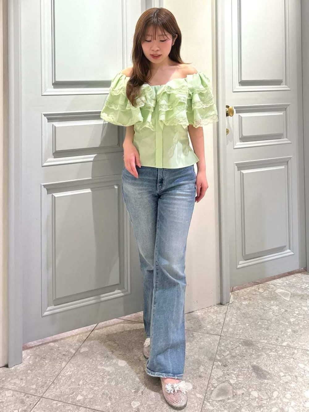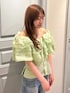 骨格ウェーブ イエベ春 ( 2nd ブルベ夏 ) ボリュームある フリルがかわいい ブラウスが主役の コーディネート🍃♡ 首周りにゴムが入っており オフショルで着ることも 可能です🙆🏻♀️ 後ろの編み上げリボンで ウエストを絞れるので 骨格ウェーブの方も スタイルアップが叶います✨ 身長:156cm 店舗名:阪急梅田店