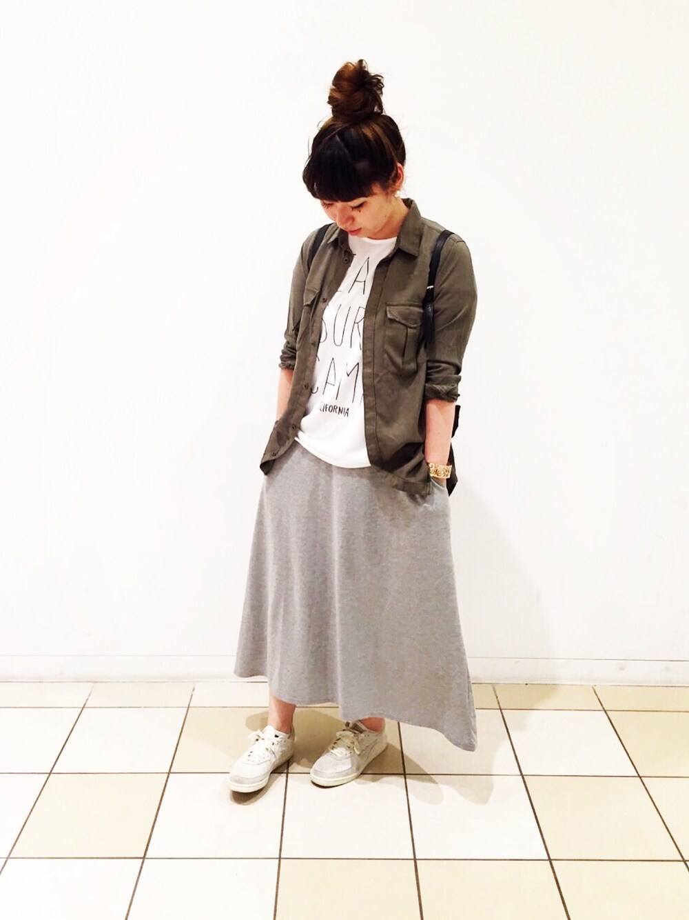 タンクのカジュアルなマキシワンピにロゴTを重ねて。カーキのテロっとしたジャケットはとっても合わせやすい。カジュアルな休日コーデ✨