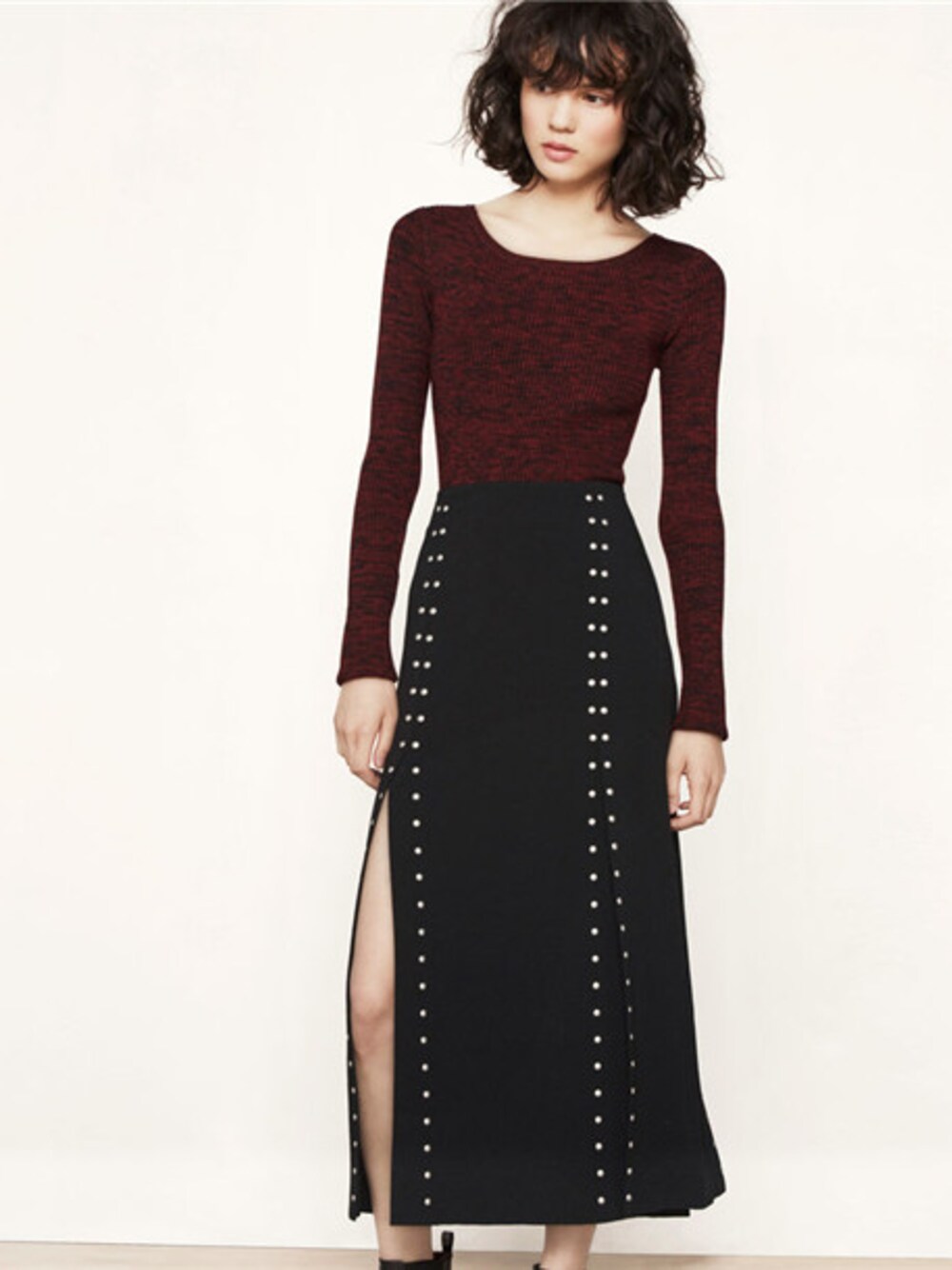 Long slit skirt with studs JUDE. Made from crêpe, this skirt features delicate rows of metal studs along each slit. It also has a high waist and a concealed back zip. Perfect over a marl knit sweater, teamed with a pair of low-top ankle boots for a rock chick look! http://www.lily-store.com/goods.php?id=1276