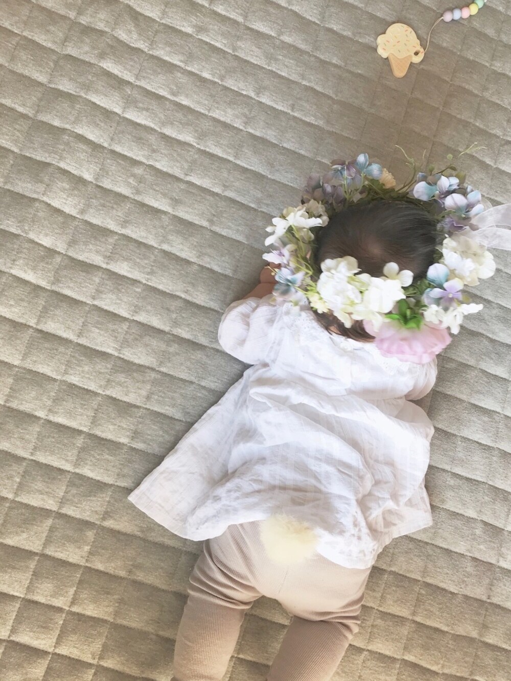 急に寒くなってきたのに りぃは極度の暑がり⍨⃝︎ BASEで買ってあった フリルブラウスに うさぎスパッツをはかせてみる❁︎ 寝返りしたお尻が可愛すぎる⑅︎