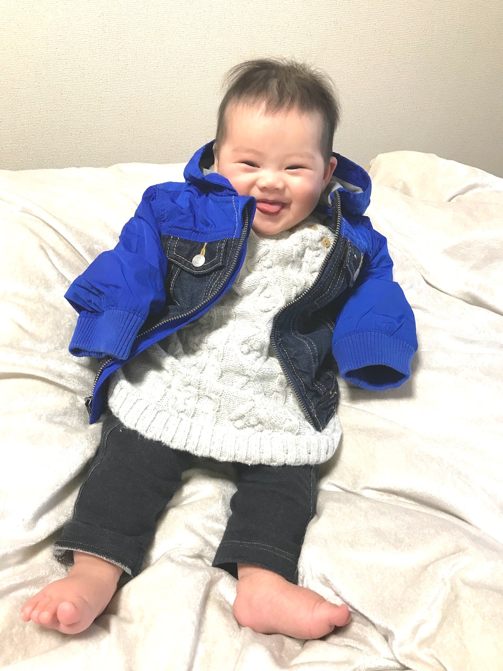 りぃたん、冬用ジャケットを着て ニコニコです¨̮♡︎ ママはこういうデザインが好きすぎて、 薄毛のりぃたんは、 男の子に間違えられないか不安です🙏 春先にチュールスカートと合わせたいな 絶対可愛いな💕