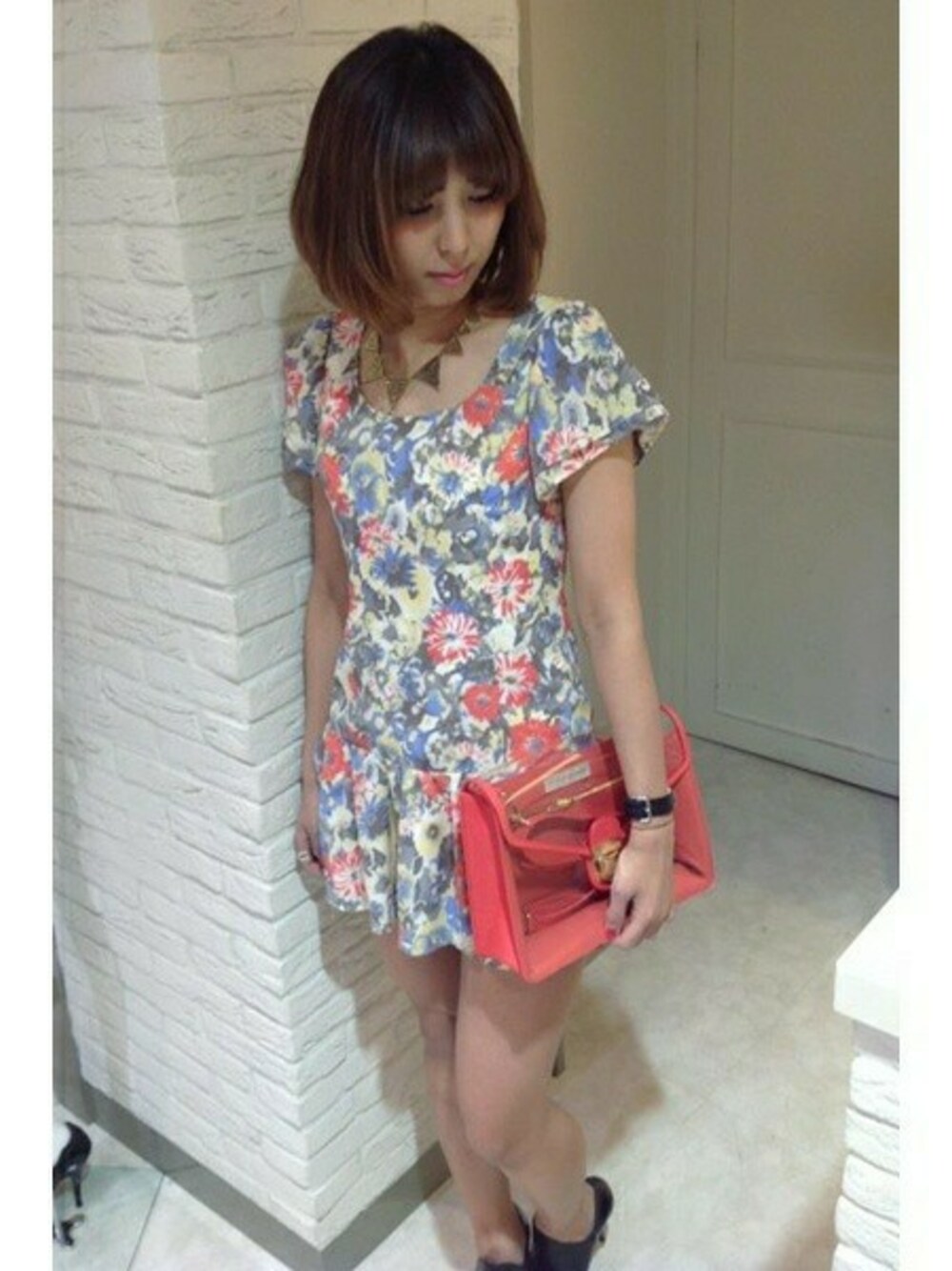 レトロ感のある落ち着いたフラワープリントなら 挑戦していただきやすい着こなしに♪ 低めの位置の切り替えとフリルが 女の子らしさも引き立たせてくれます♡ バッグには、トレンドのクリアを選んで 小物から今年らしさをプラスして★