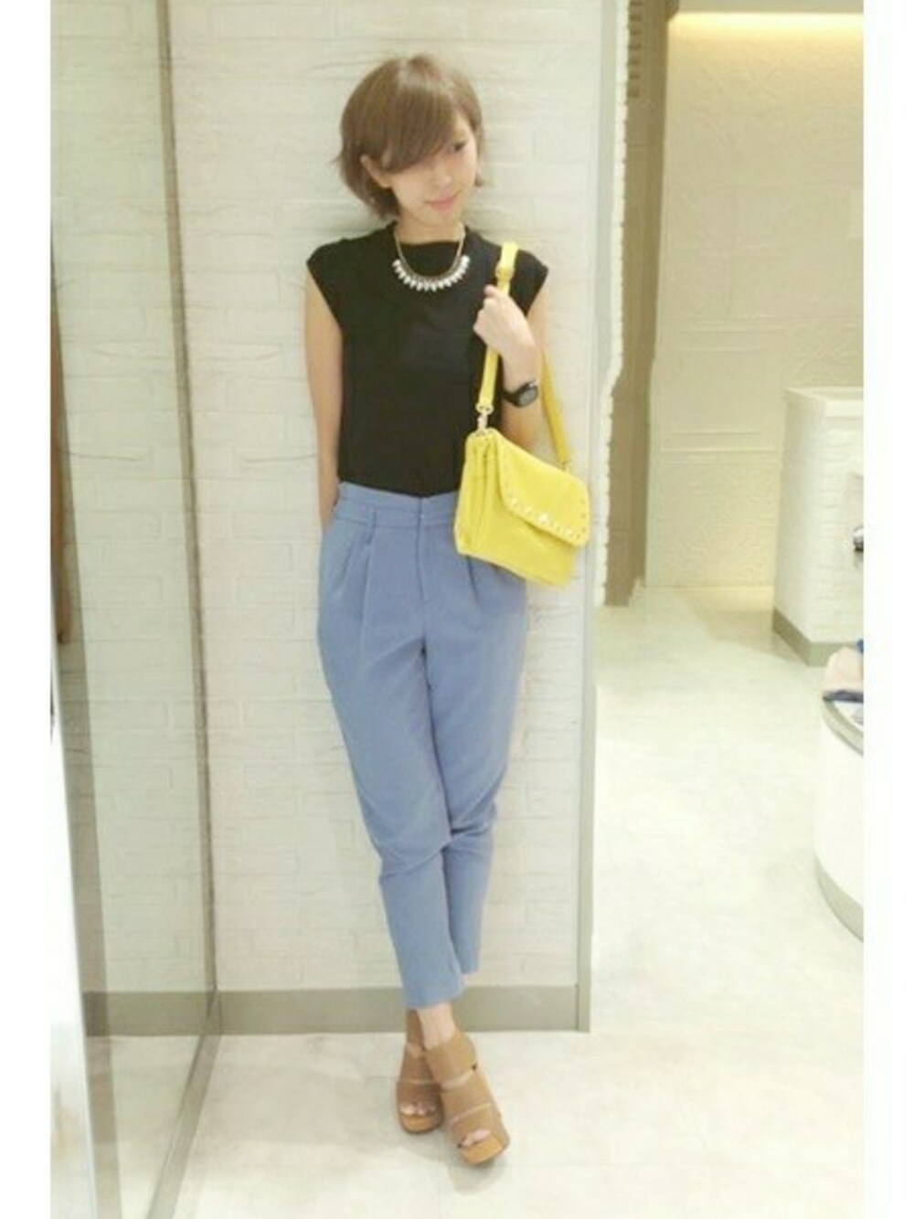 ♪秋の新作コーデ♪ トレンドのクロップド丈のトップスには ハイウエストなボトムが定番!! イエローがアイキャッチなバッグは コーディネートのポイントに★
