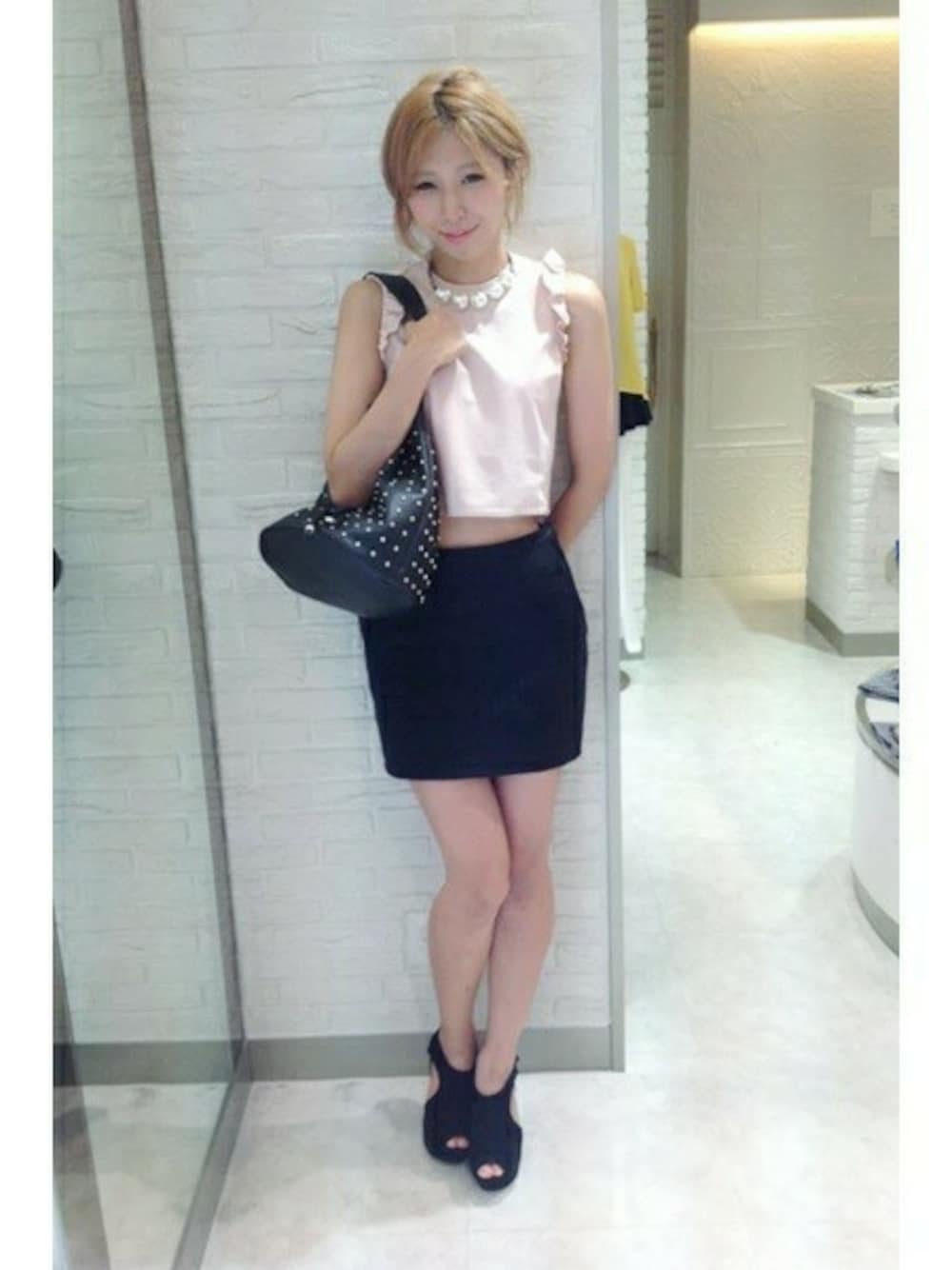 肌チラが今年らしいコーディネート♡ 淡いピンクのトップスは 他のアイテムをブラックでまとめて 甘さ控えめな着こなしがgood◎