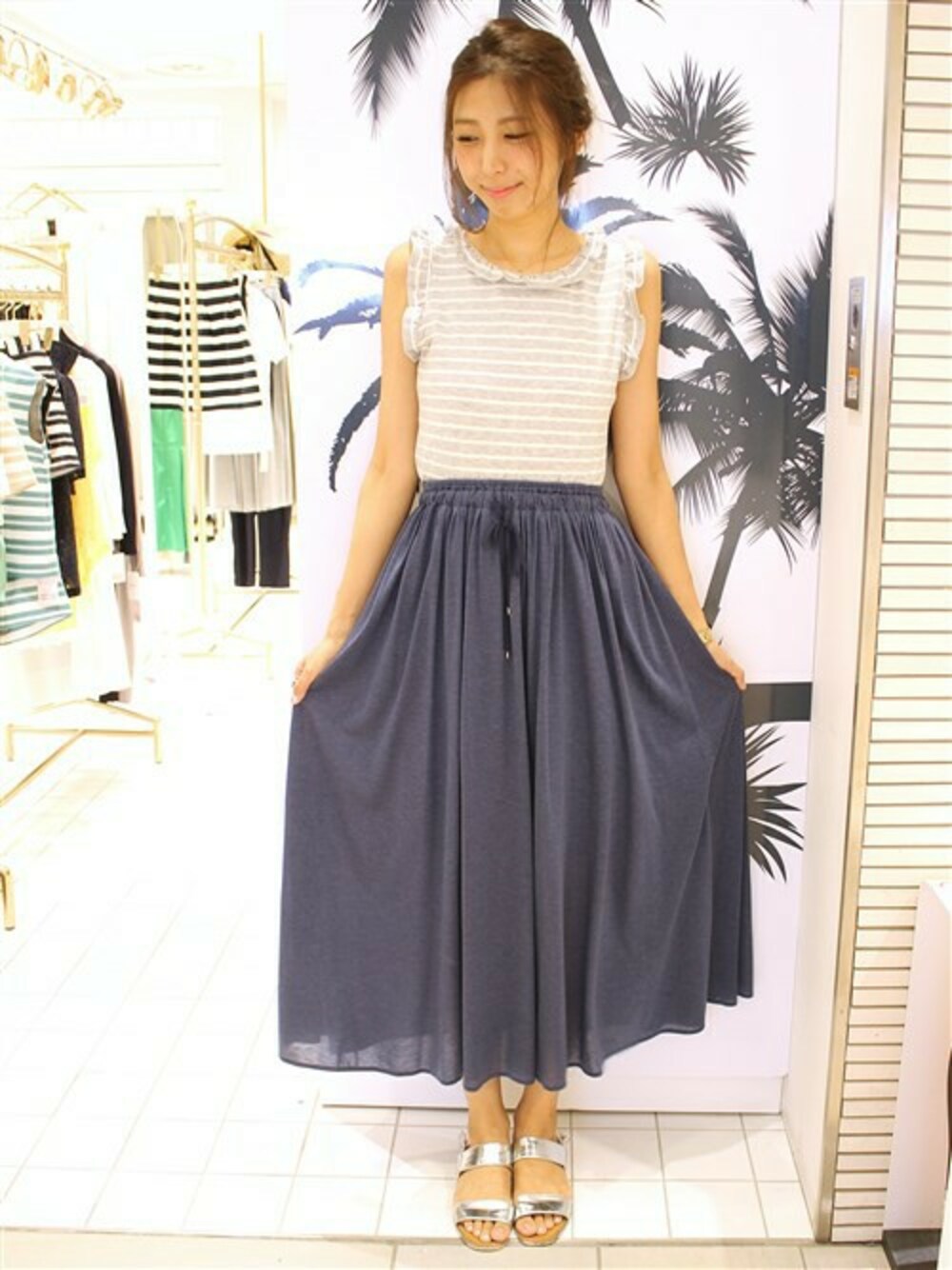 フリルがポイントになったノースリーブのアイテムをロングスカートで大人に☆