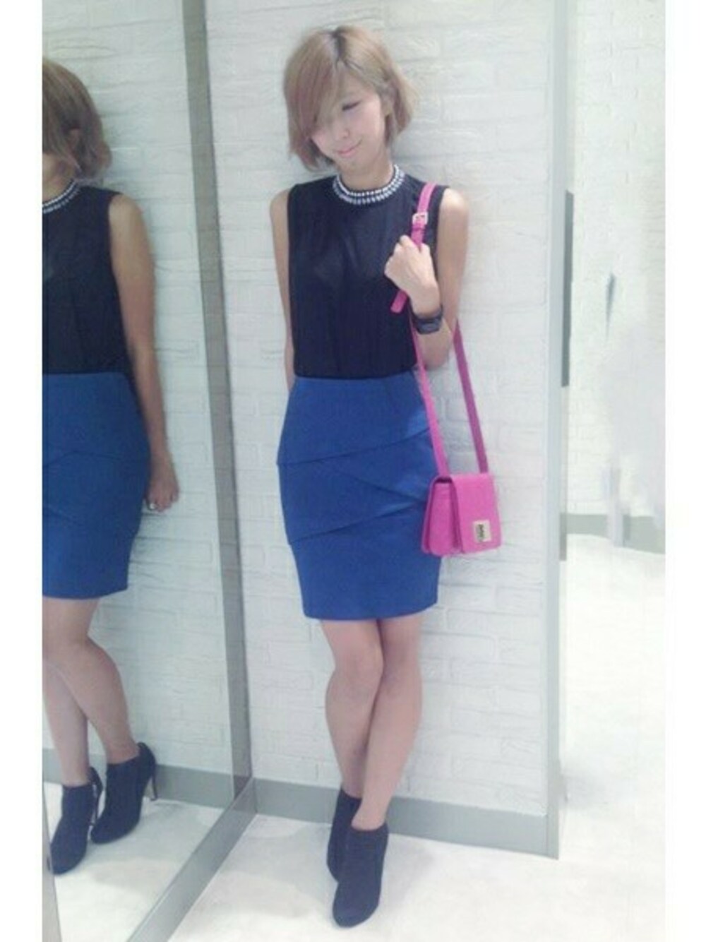 ネックラインのビジューが コーディネート全体を華やかな印象に♪ 人気のバンテージスカートを合わせれば とことん大人の雰囲気に仕上がります♡