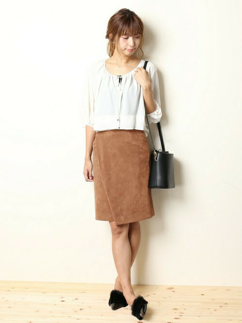 秋を感じるスエードとファーアイテムのスタイリング。スカートは立体的なので、スタイリングにメリハリがあります。