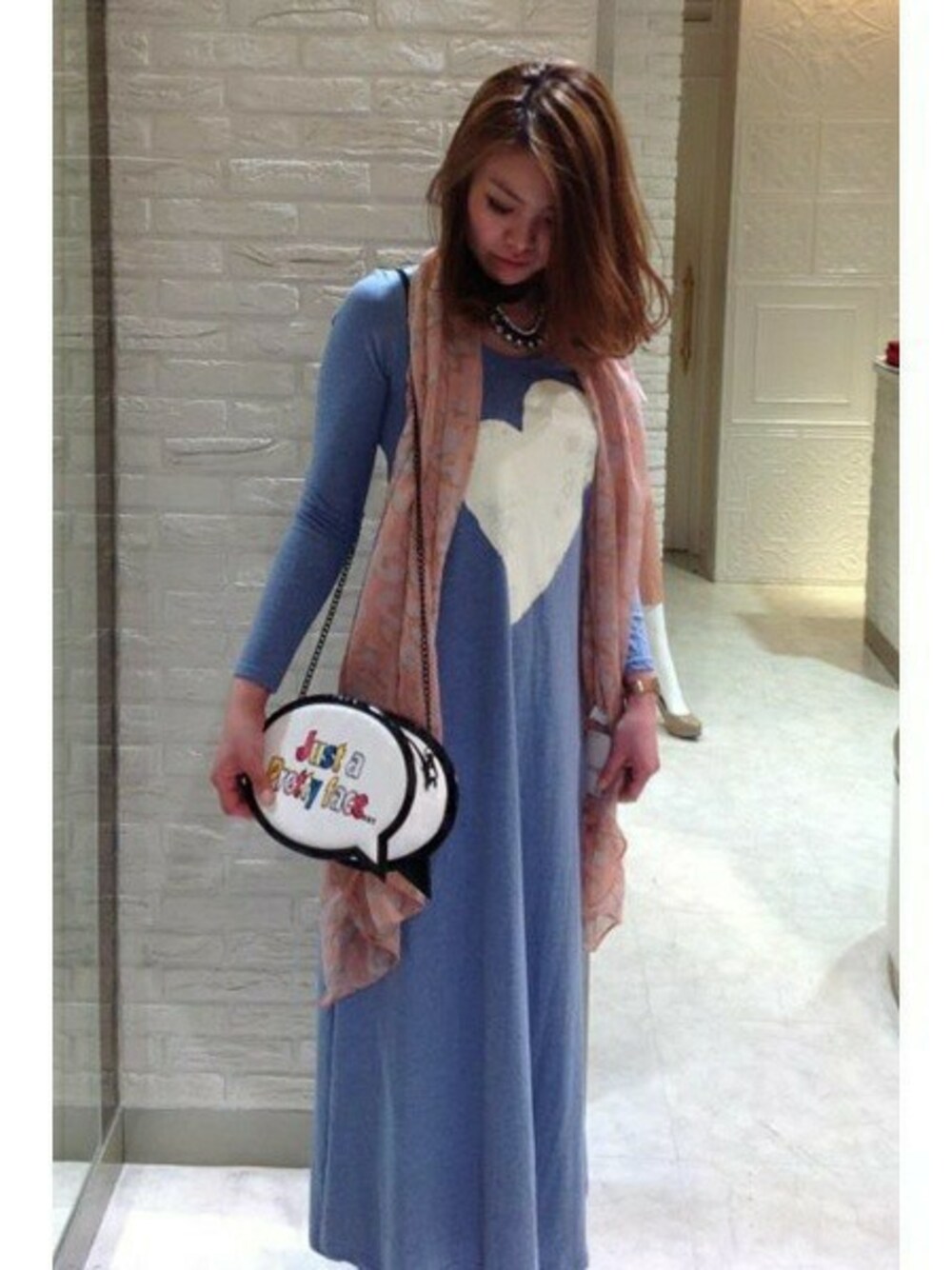 定番人気のフレアマキシ★ 今年は、ちょっと変形したハートプリントがかわいい♡ 裾広がりのフレアなシルエットは マキシでも女らしく着こなせる一枚です♪ 吹き出し型がユニークなバッグで コーディネートにハズシをプラス!