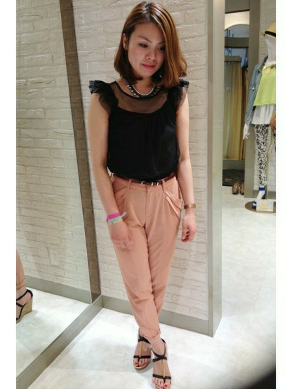 縦のラインを強調した スタイルアップなコーディネート★ 透け素材をドッキングさせた ブラウスは、大人な肌見せを 叶えてくれる女らしい一枚です♡