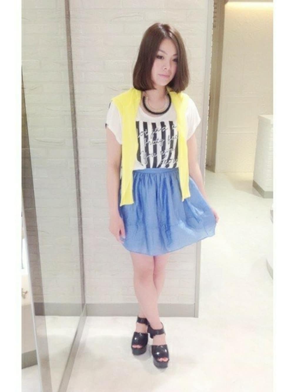 肩掛けカーデが今年らしいスタイル★ 爽やかなブルーのスカートに イエローのカーデが上手にマッチ♪