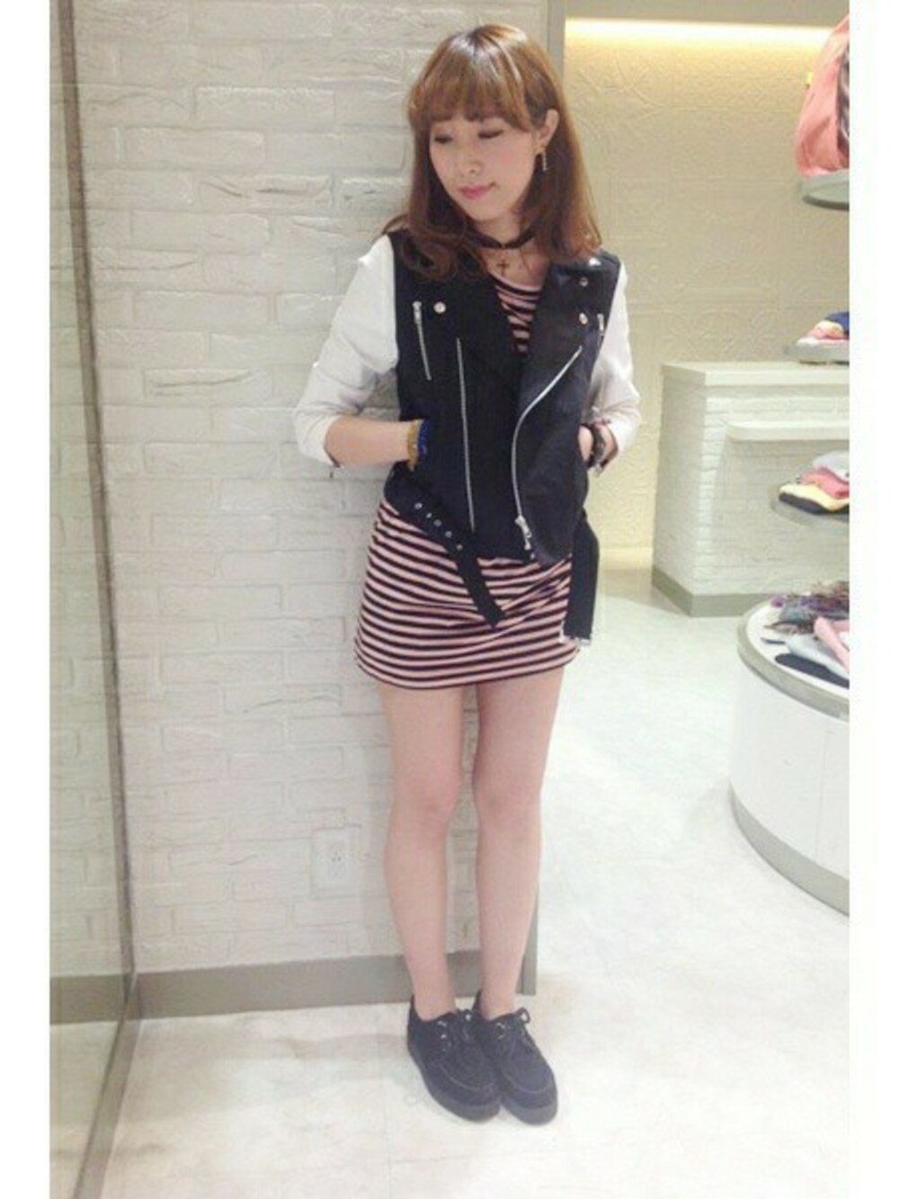 lilLillyとのコラボこーで♡♡ ピンクのボーダーがキュートな ワンピースにはライダースを 羽織ってちょっと辛口に…*´∀`* 柔らかい素材のライダースは 女の子らしい印象で着こなすことが 出来ますよ~♪