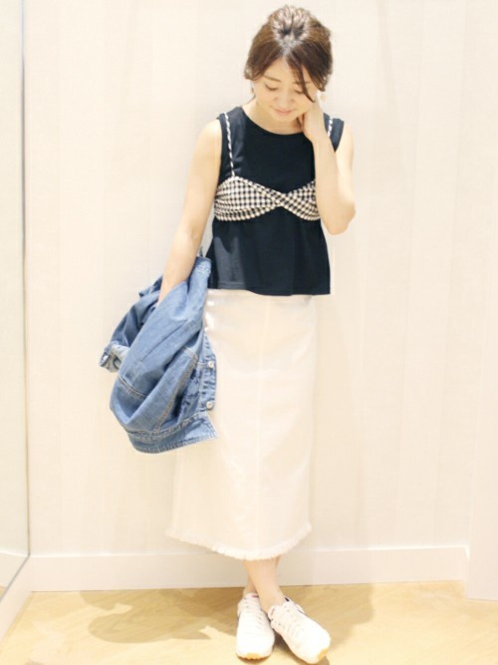 MIHOのTシャツ/カットソー「ギンガムビスチェ×Tシャツセット◆」を使ったコーディネート