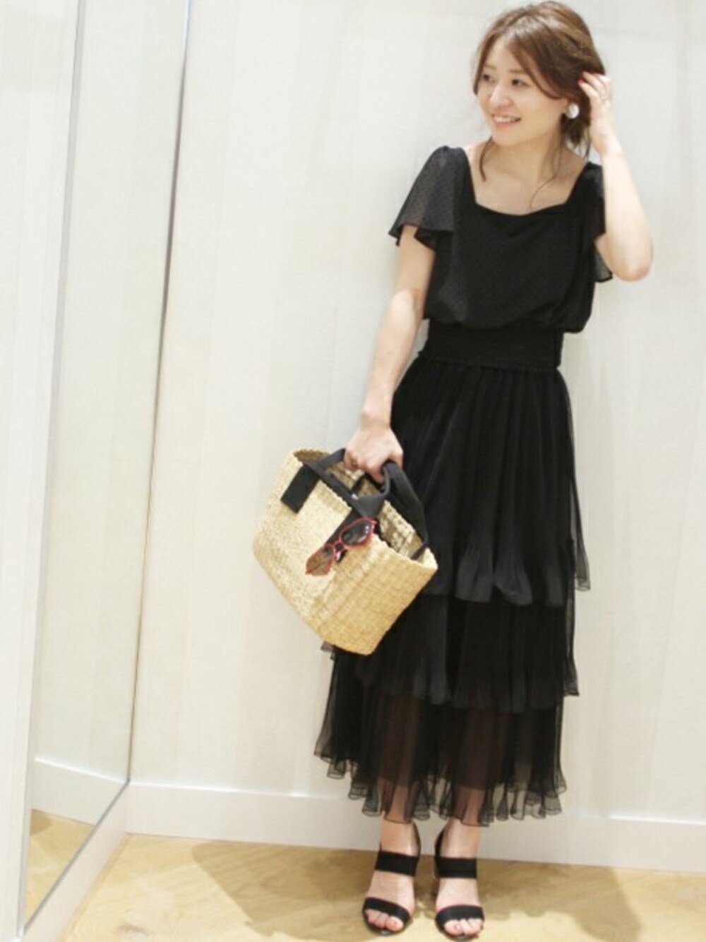 ティアードのフェミニンなスカートにはフロッキードットのトップスを合わせて女性らしくまとめました。ブラックでシンプルに合わせたので小物は、季節感あるアイテムと合わせて。