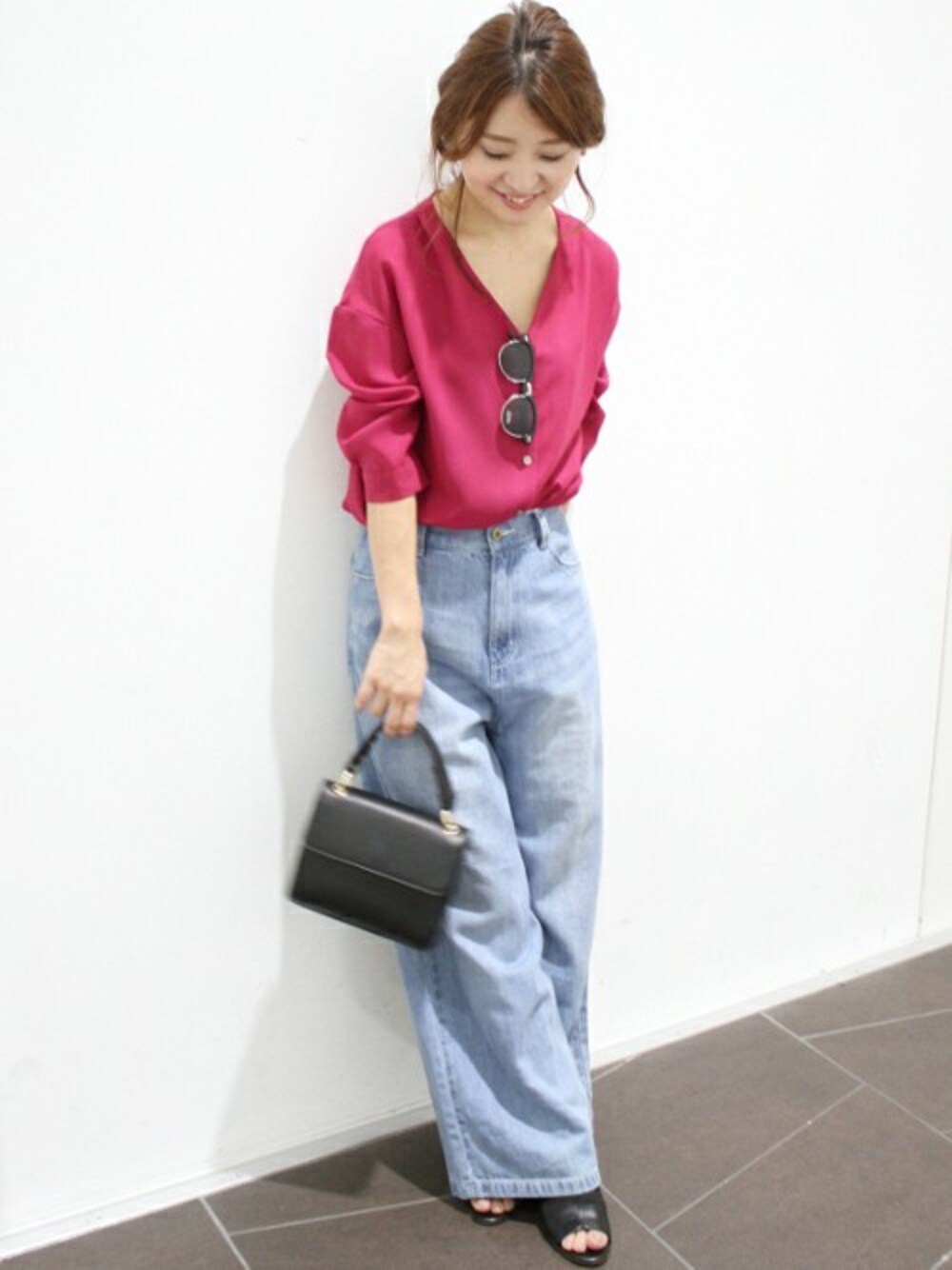 大人の抜け感漂うVあきのスキッパーブラウス。 明るめの秋色でロングシーズン着用できます。 明るめの色にはデニムでカジュアルに。 シワになりにくい素材感なので、オフィス使いにもピッタリの1枚です。