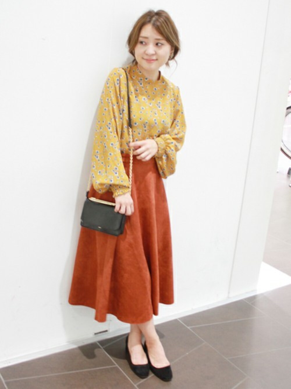 MIHOのスカート「花柄ブラウス×スエードフレアスカート◆」を使ったコーディネート