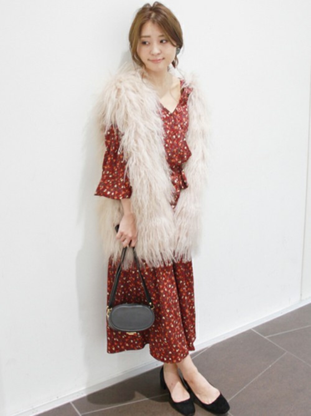 さっと羽織るだけでこなれたスタイリングが完成するファーベスト。ボリューム感が上品な印象に。156cmでもバランス良く着こなせます。
