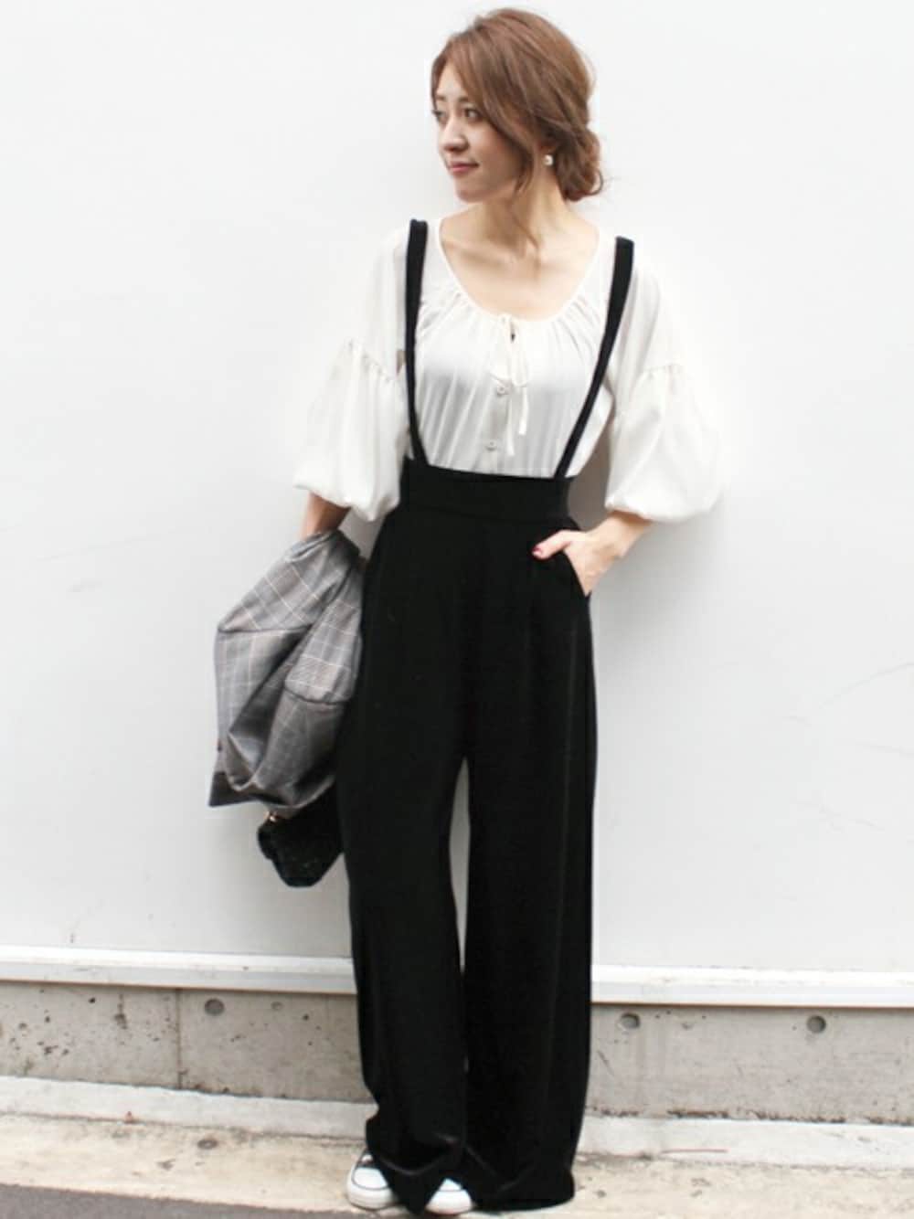 MIHOのその他パンツ「サスペンダー付きハイウエストベロアワイドパンツ◆」を使ったコーディネート