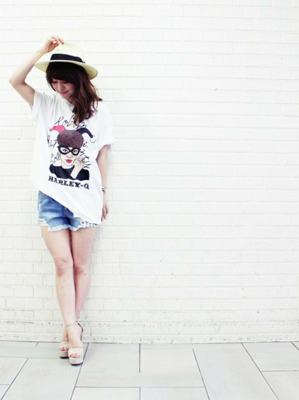 インパクトのあるフェイスTは、シンプルに デニムのショートパンツを合わせて 夏らしくラフでカジュアルにスタイリングして★