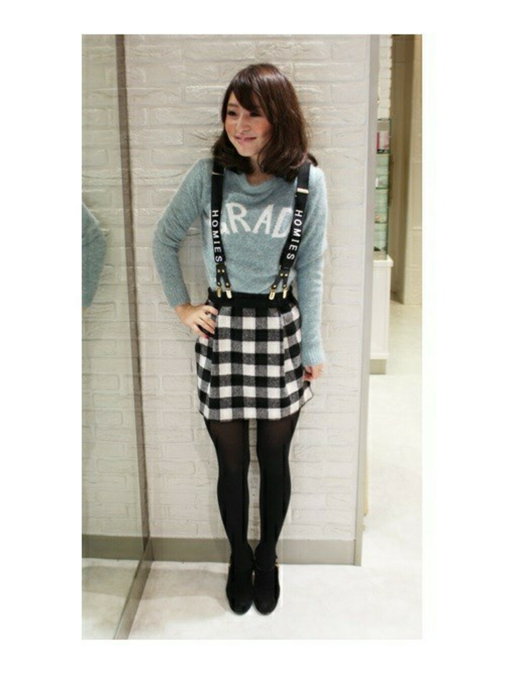 ロゴ・サスペンダー・チェックとトレンド満載のコーディネート♪ チェックスカートは、タイトミニで取り入れるのが旬★