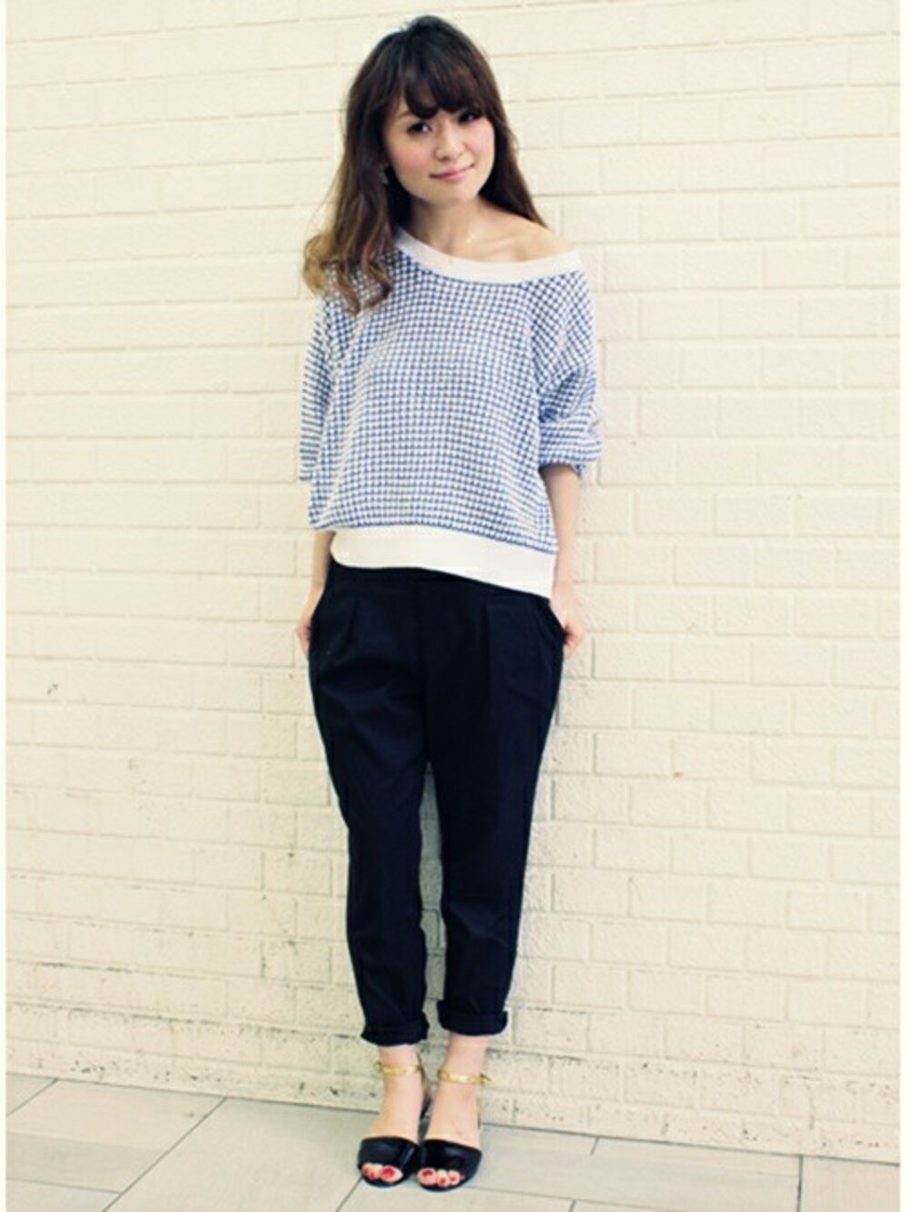 爽やかなサマーニットを、ちょっと着崩して旬なな着こなし★ キレイめパンツですが、足元はサンダルで抜け感を♪