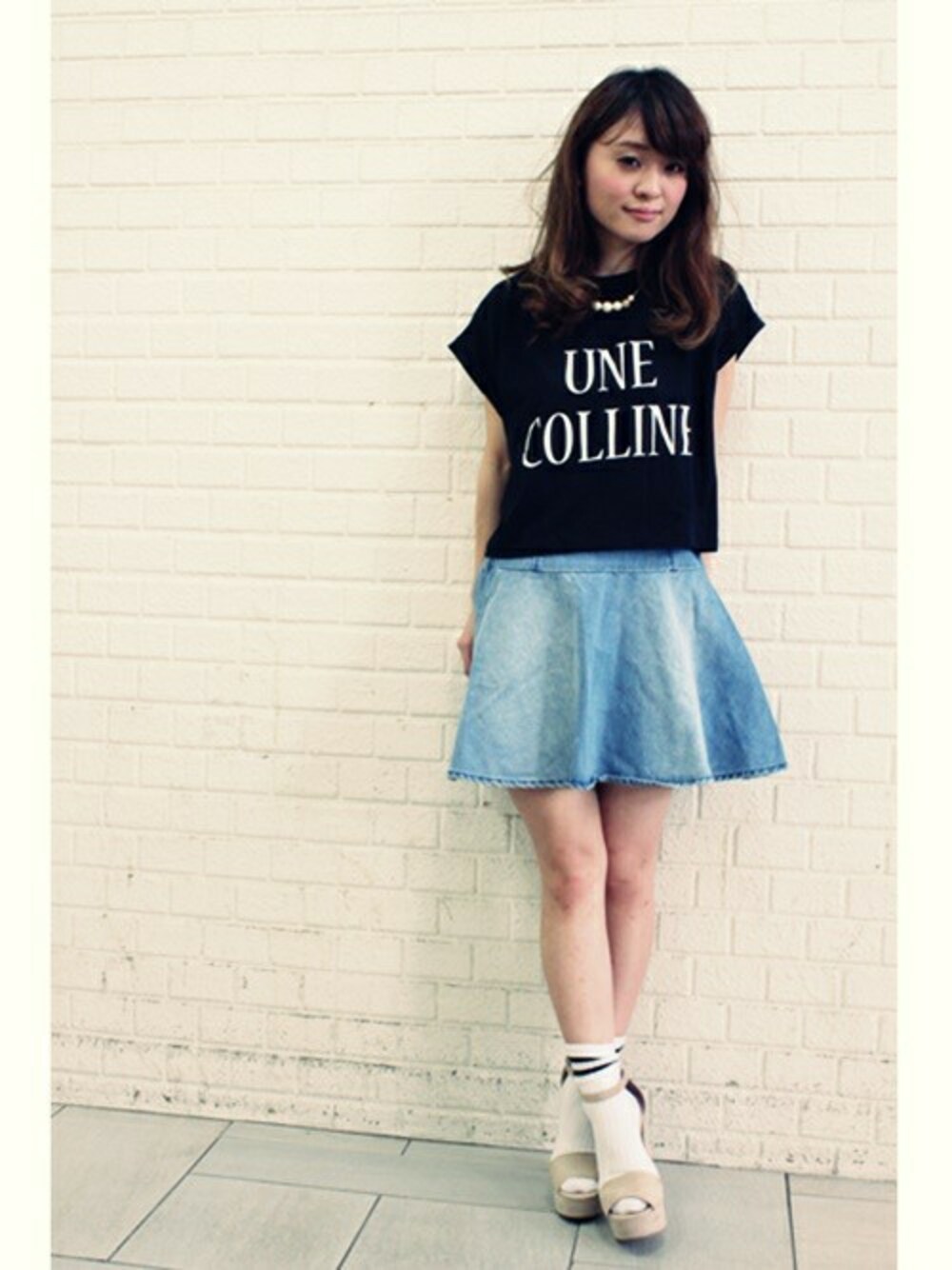 Tシャツ×デニムスカートの定番カジュアルコーデ。 フレアに広がったスカートがカジュアルな中に 女の子らしさをアピールするスタイルです★
