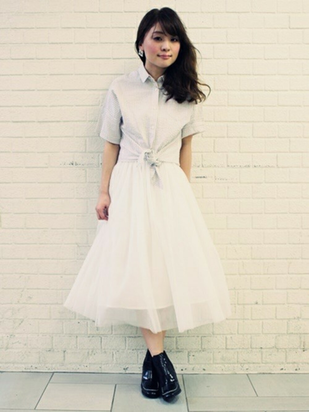 秋冬、大HIT間違いなしのチュールスカート! ショート丈がトレンディな前結びシャツでバランスよく着こなして★