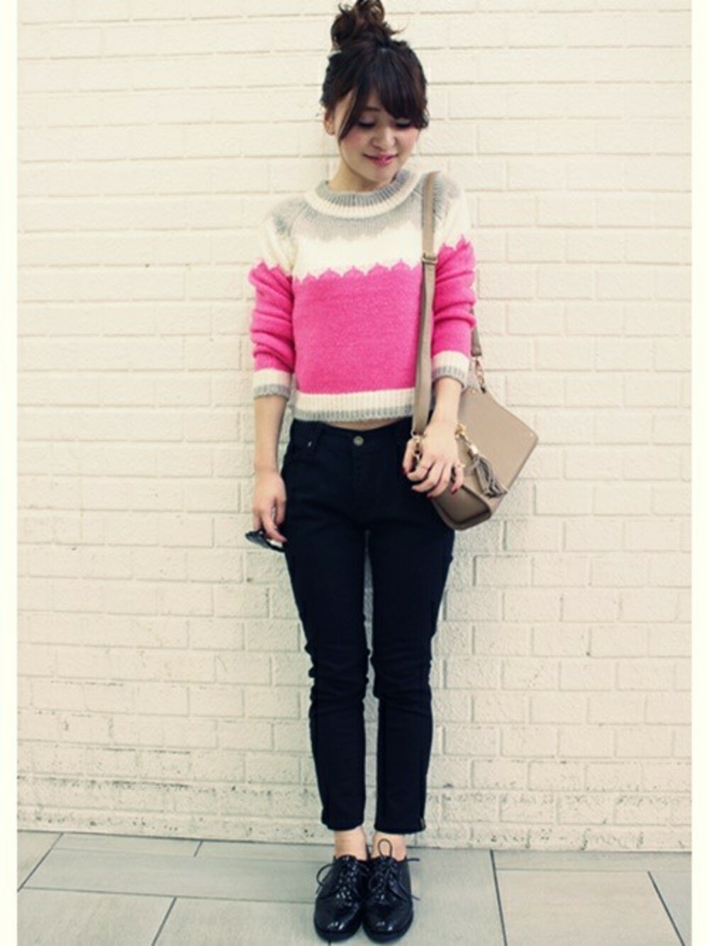 レトロなカラーリングがかわいいニット★ ブラックスキニーと合わせて落ち着きをプラスしました♪