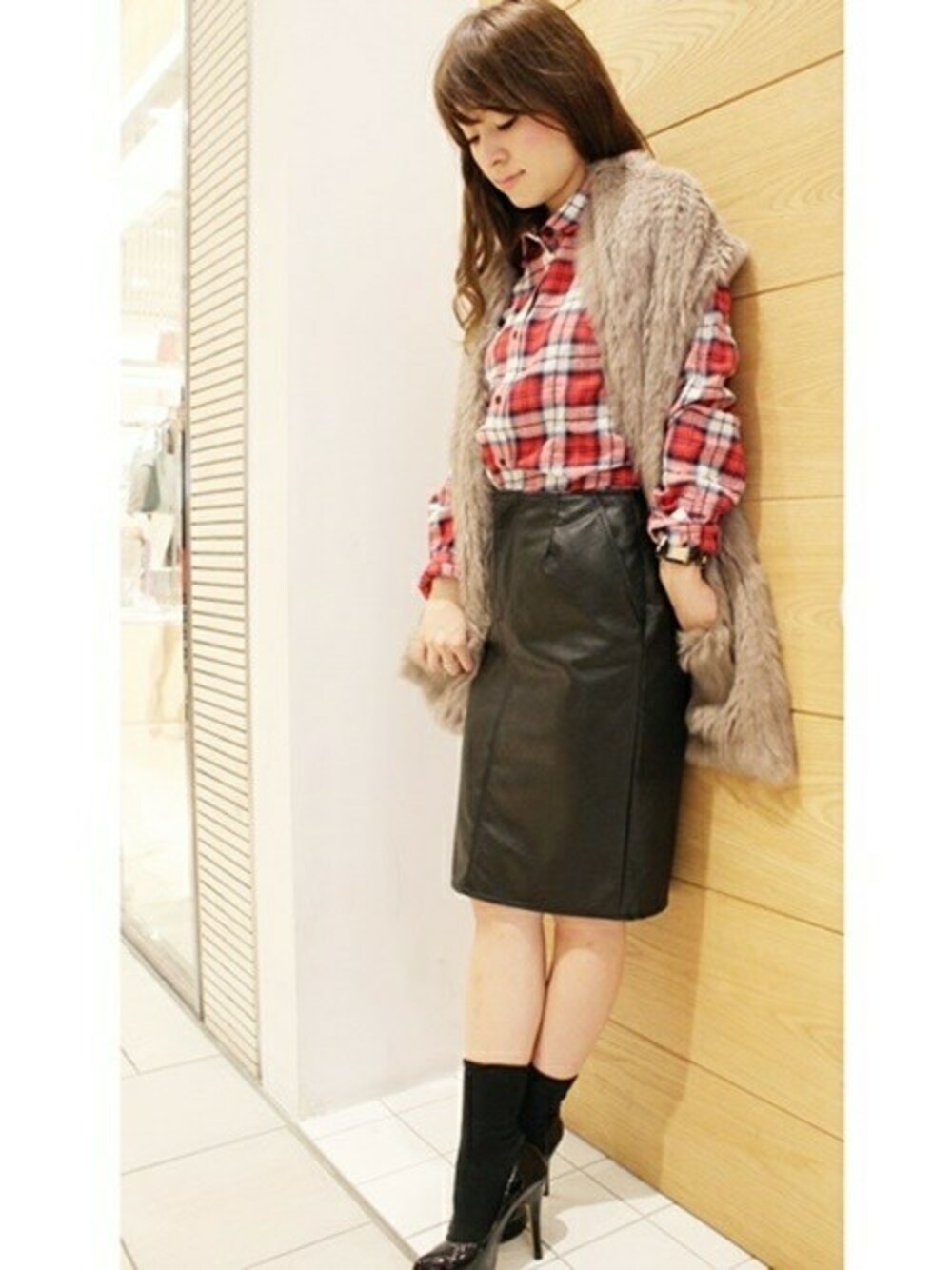 ハードなレザースカートを、あえてチェックシャツでカジュアルダウン★ 更にワンポイント加えるなら、ファーストールを♪