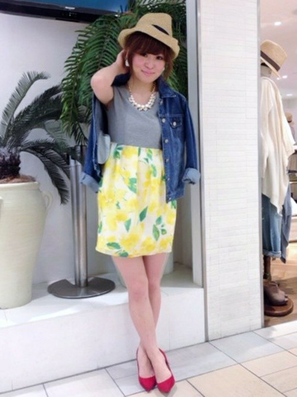 春のデートコーデ♪ 爽やかなフラワープリントはLIMITのオリジナル。 トレンドのGジャンを肩掛けしてカジュアルさアップ。