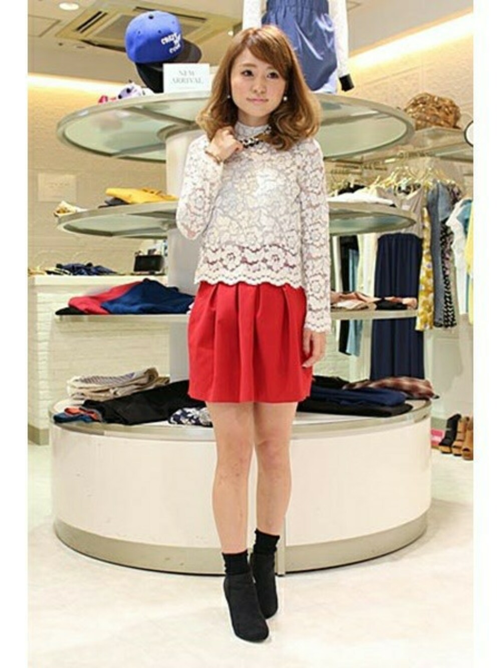 総レースがフェミニンな印象。 女の子らしさアップの真っ赤なスカートは コーディネートのポイントに!