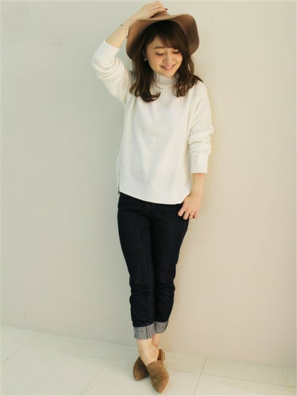ホワイトが爽やかなニットとシンプルなデニムのコーディネイトです。足元にフラットサボで抜け感をプラスしました!