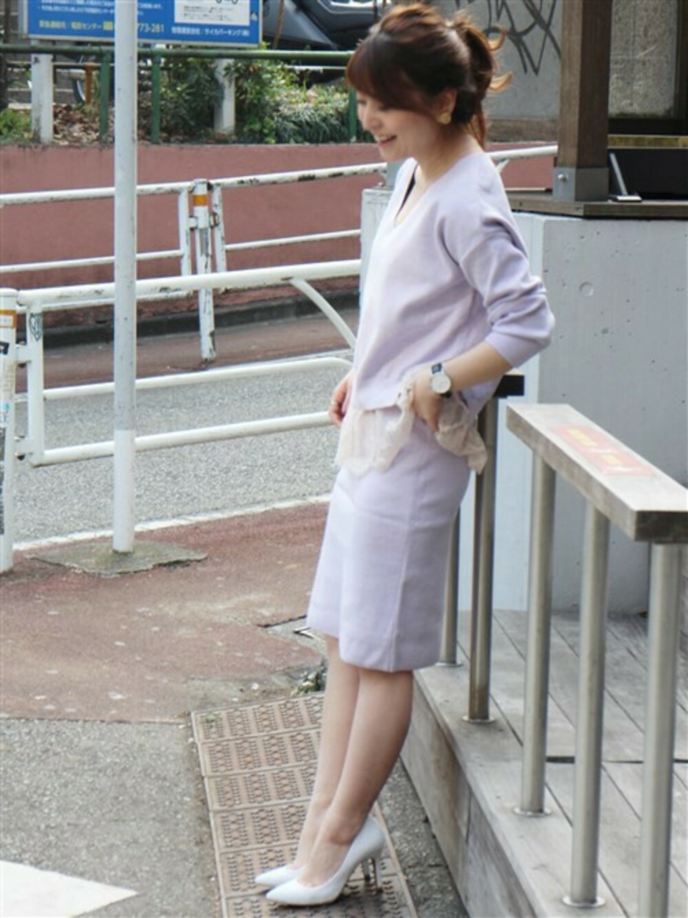 春らしいカラーのニットセットアップです!裾のレースで女性らしい印象に◎パンプスでグッと大人にすたいりんぐしました。