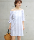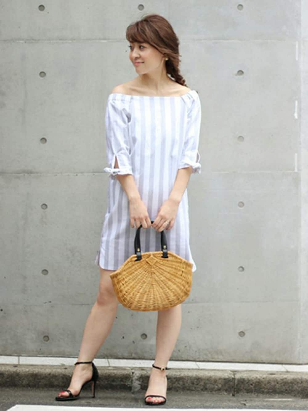 身体のシルエットをきれいに見せてくれるオフショルダーワンピースです。 型部分にゴムが入っているのでかたから落ちにくくなっているデザインもうれしいポイント。 大き目のストライプで爽やかさも◎機能性デザインどっちもかわいい優秀アイテムです!