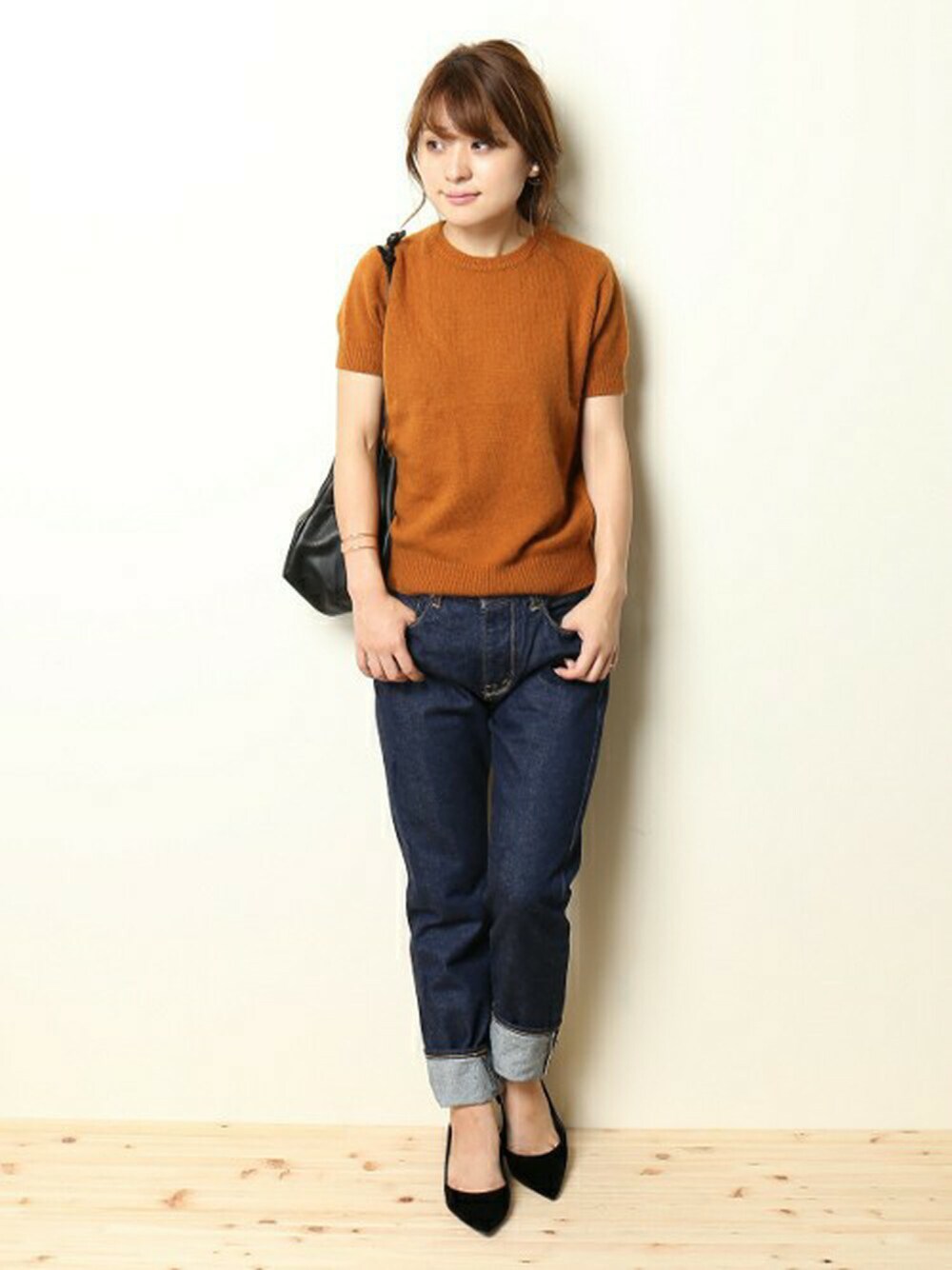 秋らしいカラーリングのニットをメインにデニムでスタイリング。落ち着いたカラーリングとパンプスでキレイめに。