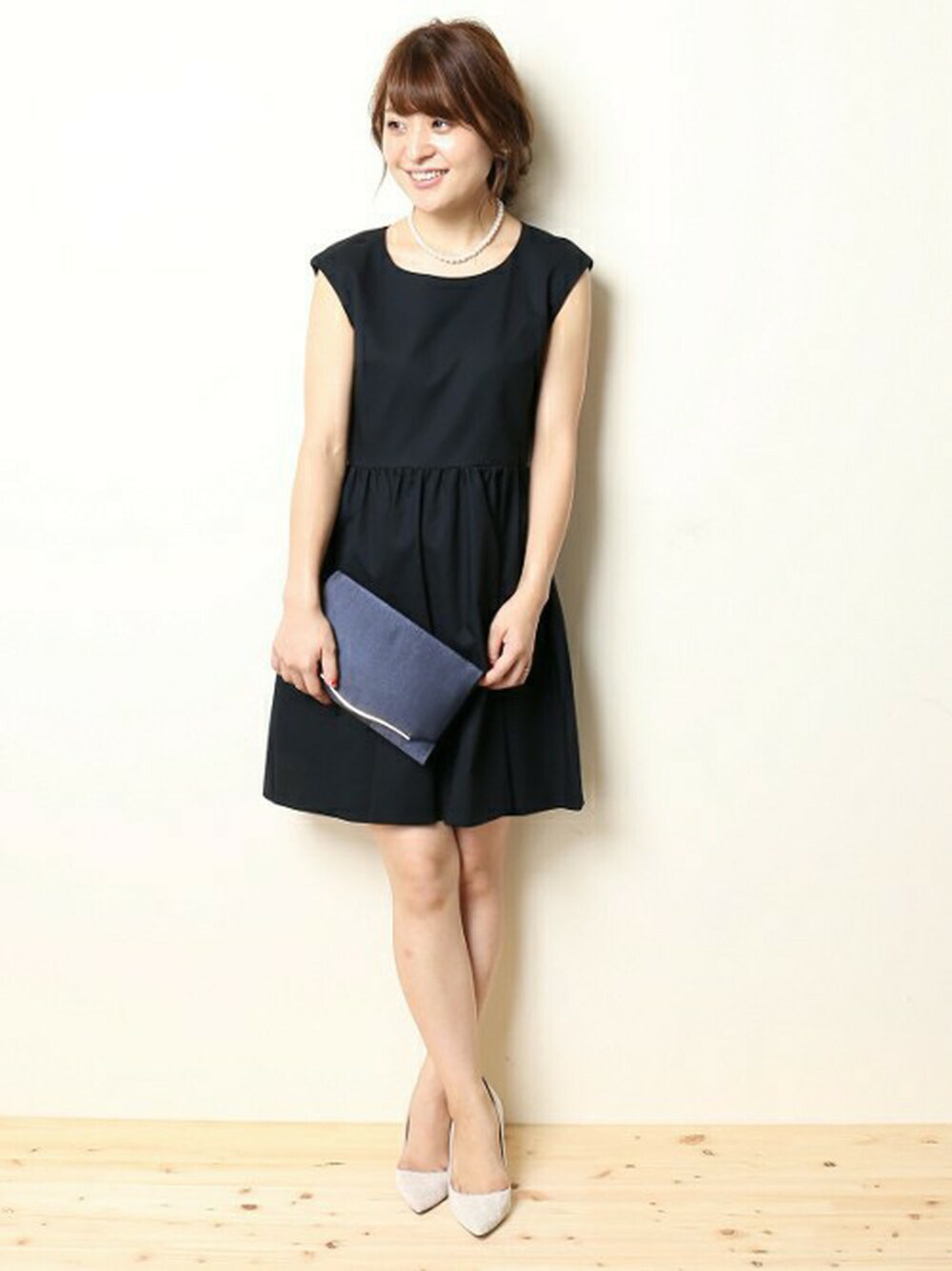 シンプルなワンピースのパールやグリッターパンプスの小物使いをアクセントにスタイリング。