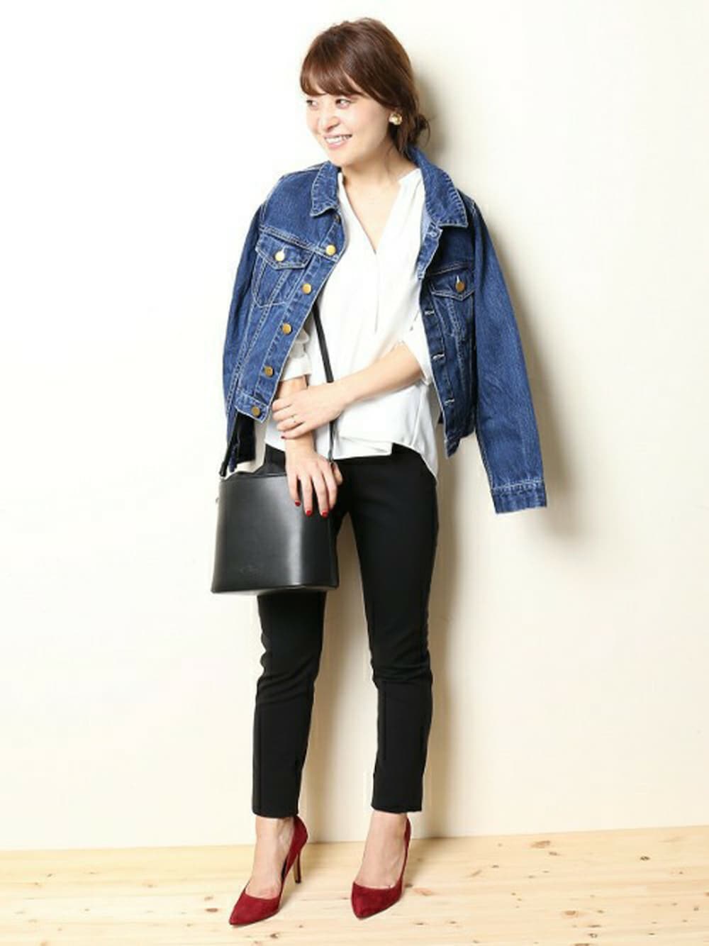 今年らしいスキッパーブラウスをシンプルにスキニーパンツで合わせたキレイめカジュアルスタイル。デニムを肩掛けするだけでこなれ感がUP!!