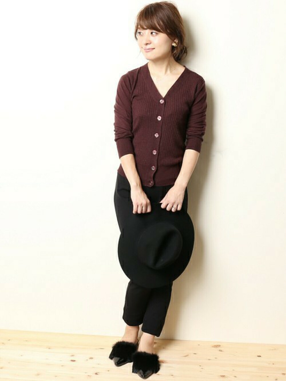 旬のリブニットをシンプルにパンツと合わせたキレイめカジュアルスタイル。ニットカーデ以外黒でまとめて大人めに。