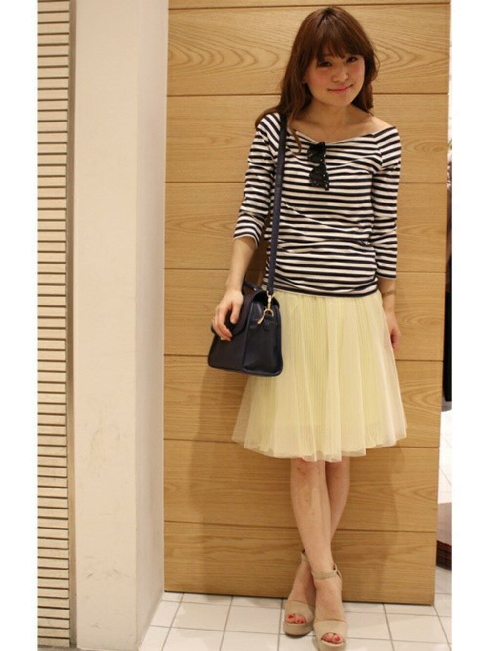 人気のボーダーオフショル×チュールスカートで トレンドど真ん中スタイル★ 膝丈のスカートは、とことんお嬢さんを 演出するマストアイテムです♪
