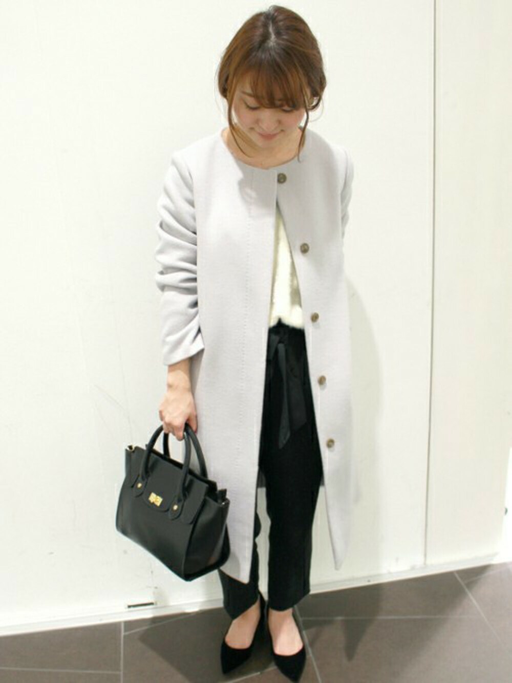 スッキリとしたIラインのキレイめなロングコートにシーズンムードたっぷりのふわふわニットにパンツで女性らしいパンツスタイルに。小物はシックに黒でまとめました。