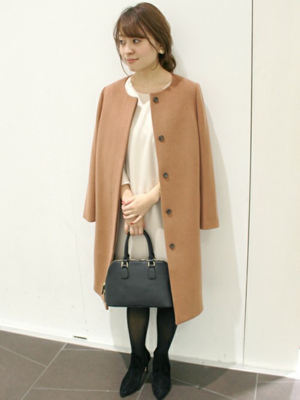 比翼仕立てもキレイ見えするコートにシンプルなワンピースを合わせたスタイリング。色のトーンを合わせ上品さを引き立てました。