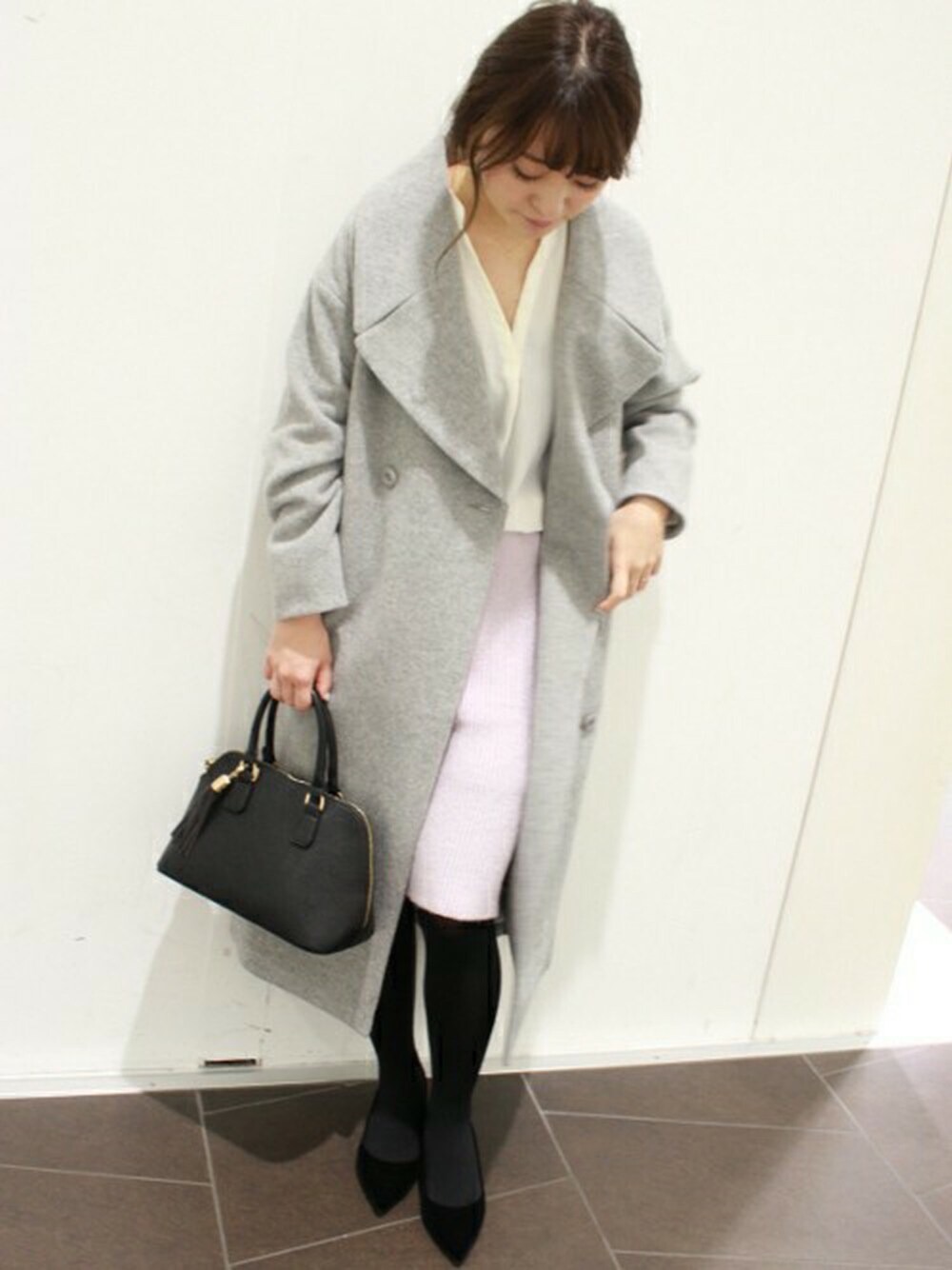 BIGショルダーのコートをメインに旬のアイテムで作る大人女子コーデ。とろみのある女性らしいブラウスをシンプルなニットスカートで合わせました。