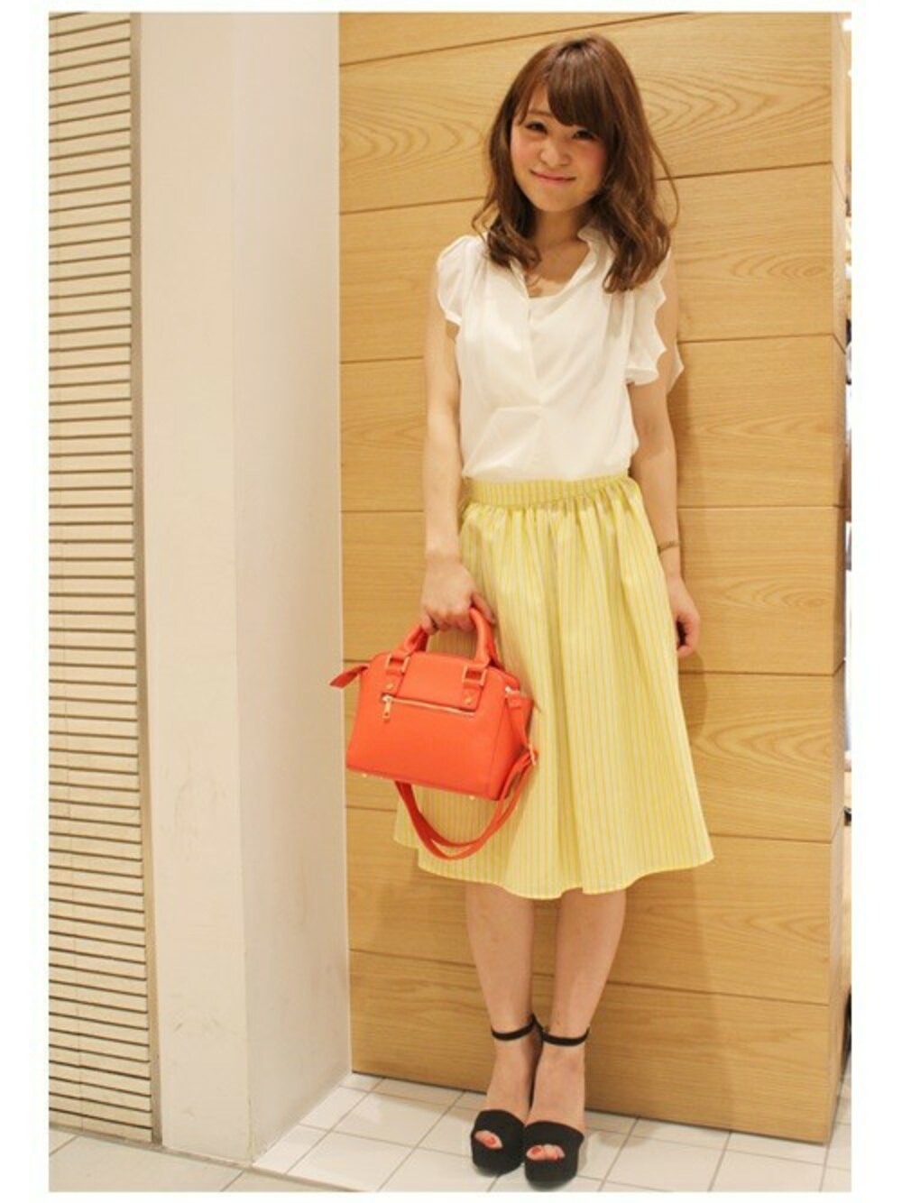 トレンドの膝丈スカートをキレイ目ブラウスで併せた オードリー風コーデ♪ ふんわりと触れるブラウスのショルダーが 女の子らしさをアップさせてくれるポイントです★