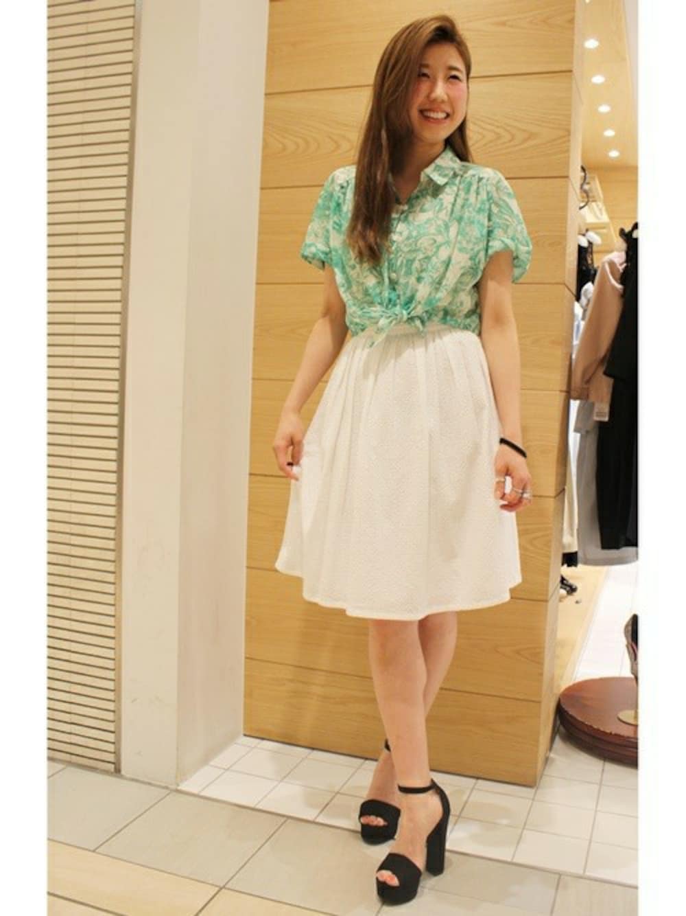 トレンドのリゾート柄が今年らしい前結びブラウス♪ フレアの膝丈スカートで、あえて女の子らしく仕上げました★
