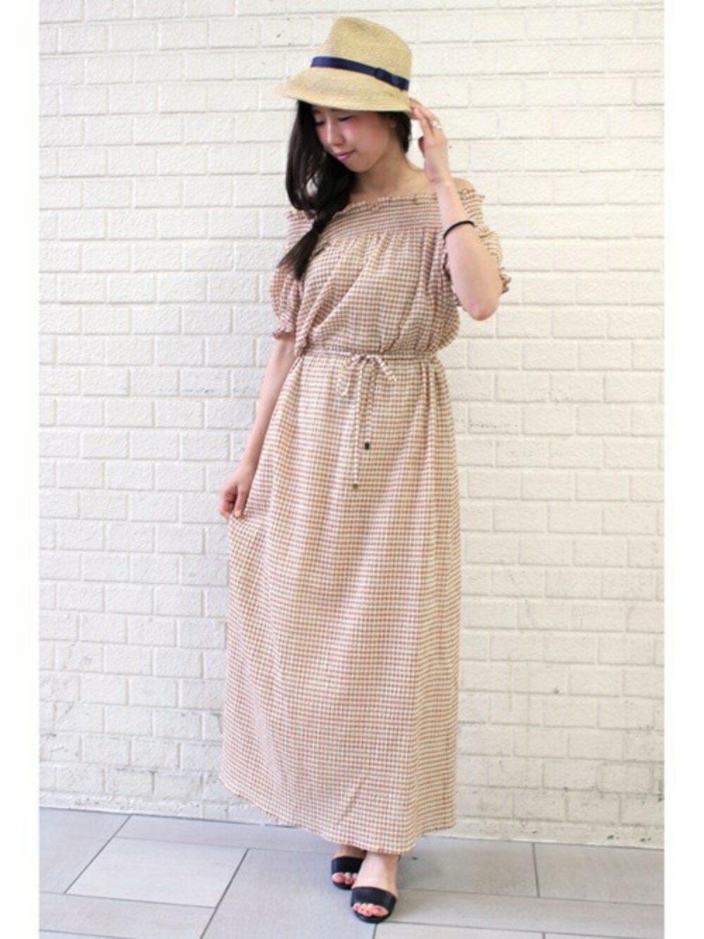 オフショルダーデザインと、爽やかなギンガムチェックが トレンドど真ん中のマキシスカート♪ 一枚で旬なコーディネートが完成しちゃう優秀アイテムです★